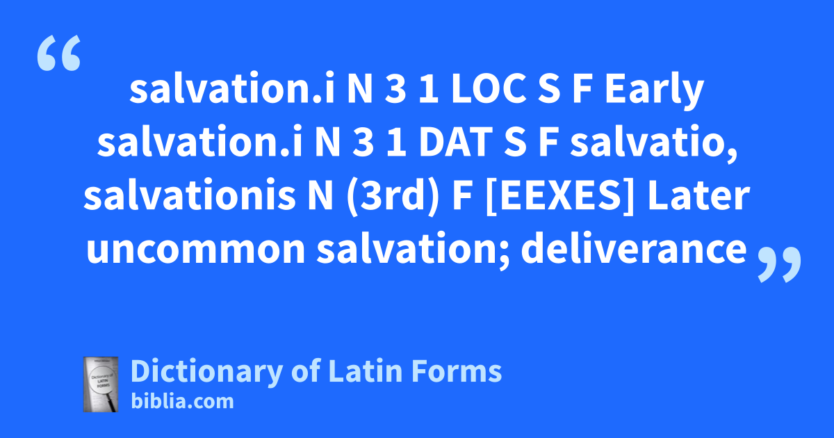 salvation.i N 3 1 LOC S F Early salvation.i N 3 1 DAT S F salvatio, salvationis N (3rd) F [EEXES] Later uncommon salvation; deliverance