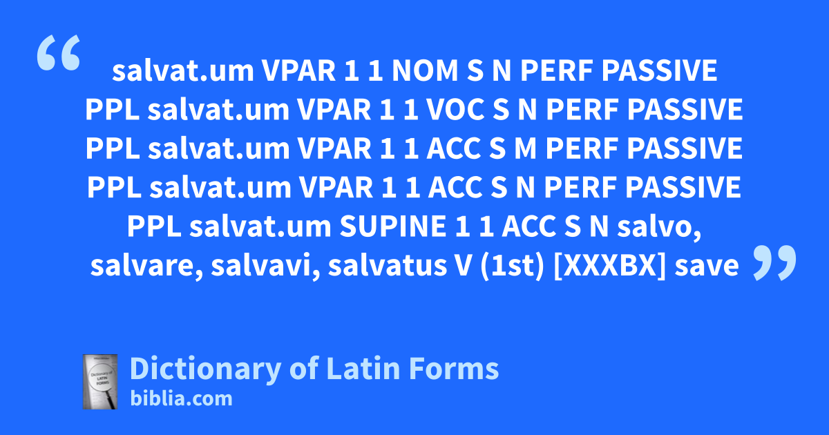salvat.um VPAR 1 1 NOM S N PERF PASSIVE PPL salvat.um VPAR 1 1 VOC S N PERF PASSIVE PPL salvat.um VPAR 1 1 ACC S M PERF PASSIVE PPL salvat.um VPAR 1 1 ACC S N PERF PASSIVE PPL salvat.um SUPINE 1 1 ACC S N salvo, salvare, salvavi, salvatus V (1st) [XXXBX] save