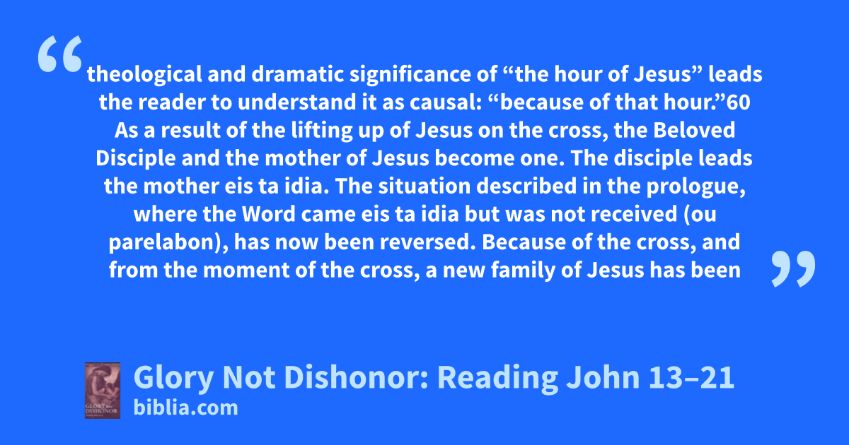 theological and dramatic significance of “the hour of Jesus” leads the reader to understand it as causal: “because of that hour.”60 As a result of the lifting up of Jesus on the cross, the Beloved Disciple and the mother of Jesus become one. The disciple leads the mother eis ta idia. The situation described in the prologue, where the Word came eis ta idia but was not received (ou parelabon), has now been reversed. Because of the cross, and from the moment of the cross, a new family of Jesus has been