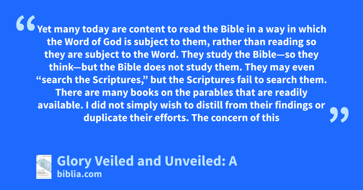 Yet many today are content to read the Bible in a way in which the Word of God is subject to them, rather than reading so they are subject to the Word. They study the Bible—so they think—but the Bible does not study them. They may even “search the Scriptures,” but the Scriptures fail to search them. There are many books on the parables that are readily available. I did not simply wish to distill from their findings or duplicate their efforts. The concern of this