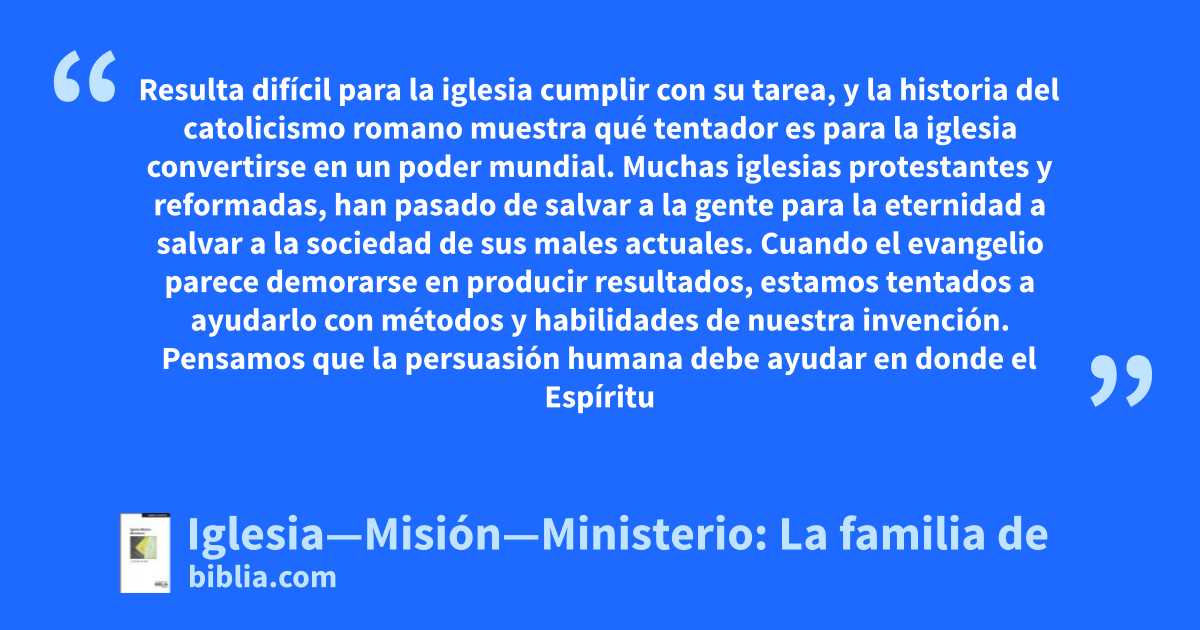 Resulta difícil para la iglesia cumplir con su tarea, y la historia del catolicismo romano muestra qué tentador es para la iglesia convertirse en un poder mundial. Muchas iglesias protestantes y reformadas, han pasado de salvar a la gente para la eternidad a salvar a la sociedad de sus males actuales. Cuando el evangelio parece demorarse en producir resultados, estamos tentados a ayudarlo con métodos y habilidades de nuestra invención. Pensamos que la persuasión humana debe ayudar en donde el Espíritu