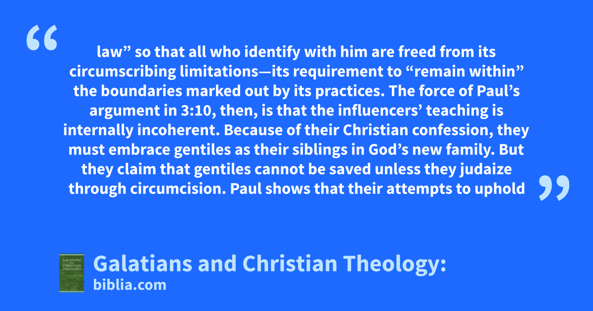 law” so that all who identify with him are freed from its circumscribing limitations—its requirement to “remain within” the boundaries marked out by its practices. The force of Paul’s argument in 3:10, then, is that the influencers’ teaching is internally incoherent. Because of their Christian confession, they must embrace gentiles as their siblings in God’s new family. But they claim that gentiles cannot be saved unless they judaize through circumcision. Paul shows that their attempts to uphold
