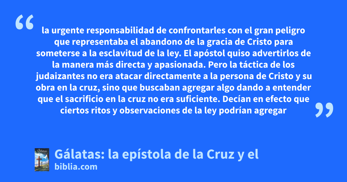 la urgente responsabilidad de confrontarles con el gran peligro que representaba el abandono de la gracia de Cristo para someterse a la esclavitud de la ley. El apóstol quiso advertirlos de la manera más directa y apasionada. Pero la táctica de los judaizantes no era atacar directamente a la persona de Cristo y su obra en la cruz, sino que buscaban agregar algo dando a entender que el sacrificio en la cruz no era suficiente. Decían en efecto que ciertos ritos y observaciones de la ley podrían agregar