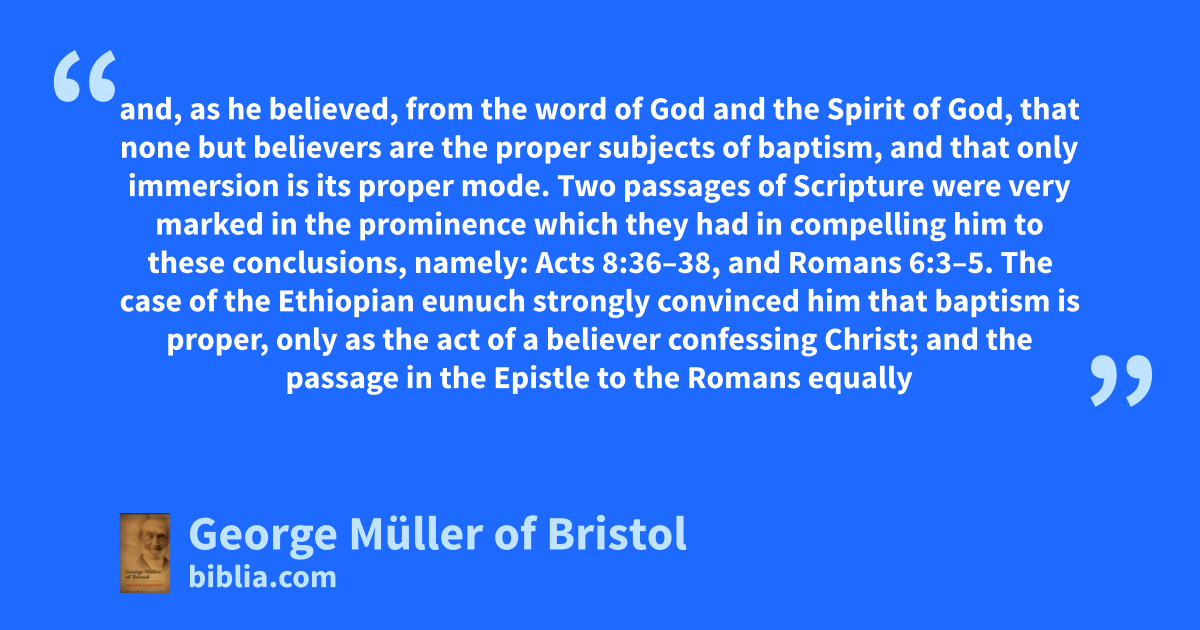 and, as he believed, from the word of God and the Spirit of God, that none but believers are the proper subjects of baptism, and that only immersion is its proper mode. Two passages of Scripture were very marked in the prominence which they had in compelling him to these conclusions, namely: Acts 8:36–38, and Romans 6:3–5. The case of the Ethiopian eunuch strongly convinced him that baptism is proper, only as the act of a believer confessing Christ; and the passage in the Epistle to the Romans equally