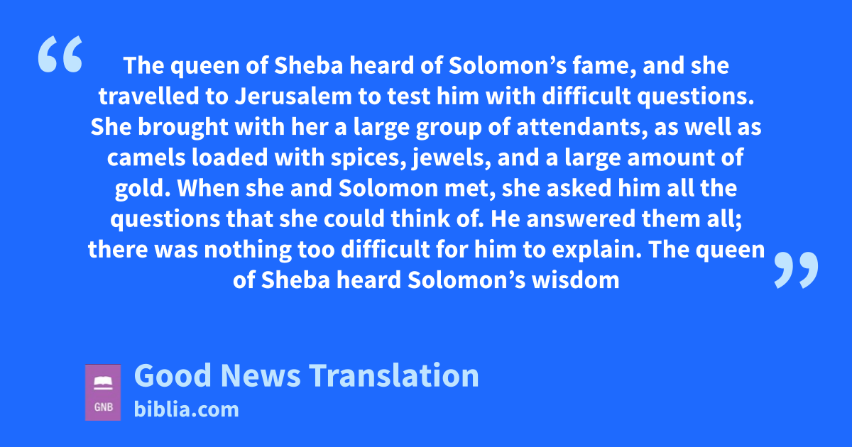 10 * The queen of Sheba heard of Solomon’s fame,d and she travelled to Jerusalem to test him with difficult questions. 2*She brought with her a large group of attendants, as well as camels loaded with spices, jewels, and a large amount of gold. When she and Solomon met, she asked him all the questions that she could think of. 3*He answered them all; there was nothing too difficult for him to explain. 4*The queen of Sheba heard Solomon’s wisdom and saw the palace he had built. 5*She saw the food that was served at his table, the living quarters for his officials, the organization of his palace staff and the uniforms they wore, the servants who waited on him at feasts, and the sacrifices he offered in the Temple. It left her breathless and amazed. 6*She said to King Solomon, “What I heard in my own country about youe and your wisdom is true! 7*But I couldn’t believe it until I had come and seen it all for myself. But I didn’t hear even half of it; your wisdom and wealth are much greater than what I was told. 8*How fortunate are your wives!f And how fortunate your servants, who are always in your presence and are privileged to hear your wise sayings! 9*Praise the Lord your God! He has shown how pleased he is with you by making you king of Israel. Because his love for Israel is eternal, he has made you their king so that you can maintain law and justice.” 10*She presented to King Solomon the gifts she had brought: more than 4,000 kilogrammes of gold and a very large amount of spices and jewels. The amount of spices she gave him was by far the greatest that he ever received at any time.