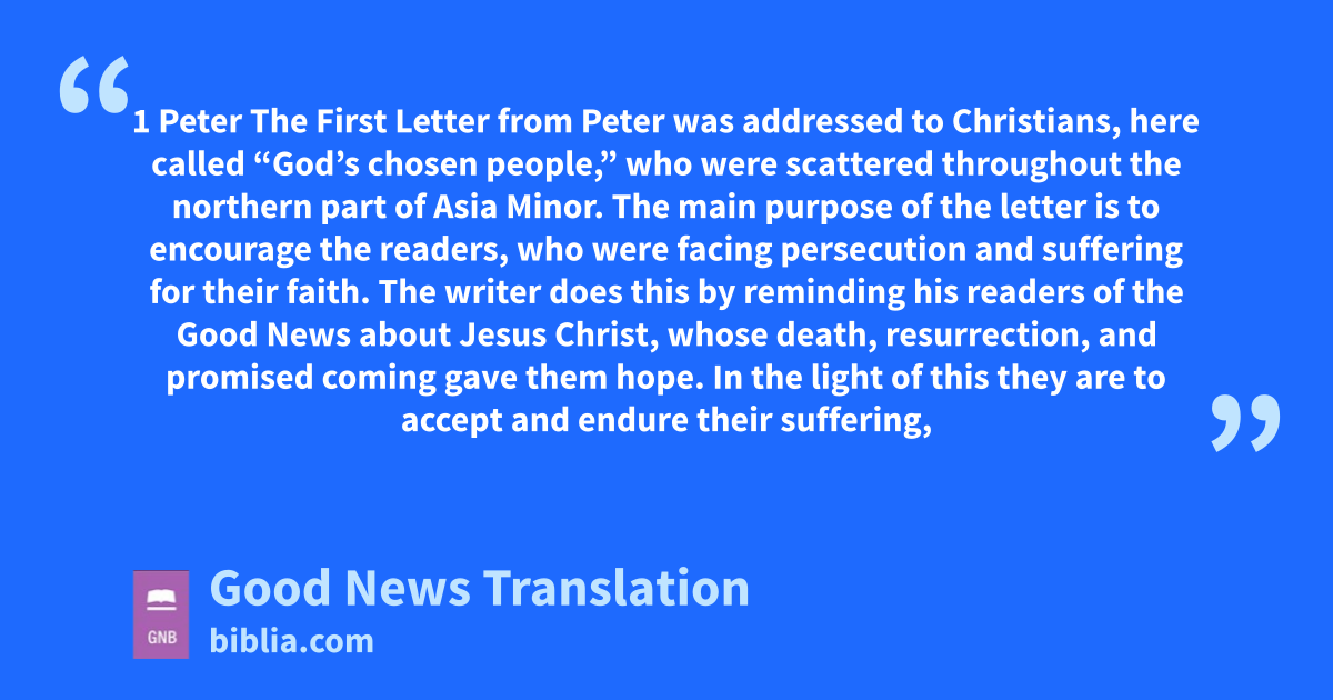 The First Letter from Peter was addressed to Christians, here called “God’s chosen people,” who were scattered throughout the northern part of Asia Minor. The main purpose of the letter is to encourage the readers, who were facing persecution and suffering for their faith. The writer does this by reminding his readers of the Good News about Jesus Christ, whose death, resurrection, and promised coming gave them hope. In the light of this they are to accept and endure their suffering, confident that it is a test of the genuineness of their faith and that they will be rewarded on “the Day when Jesus Christ is revealed.”