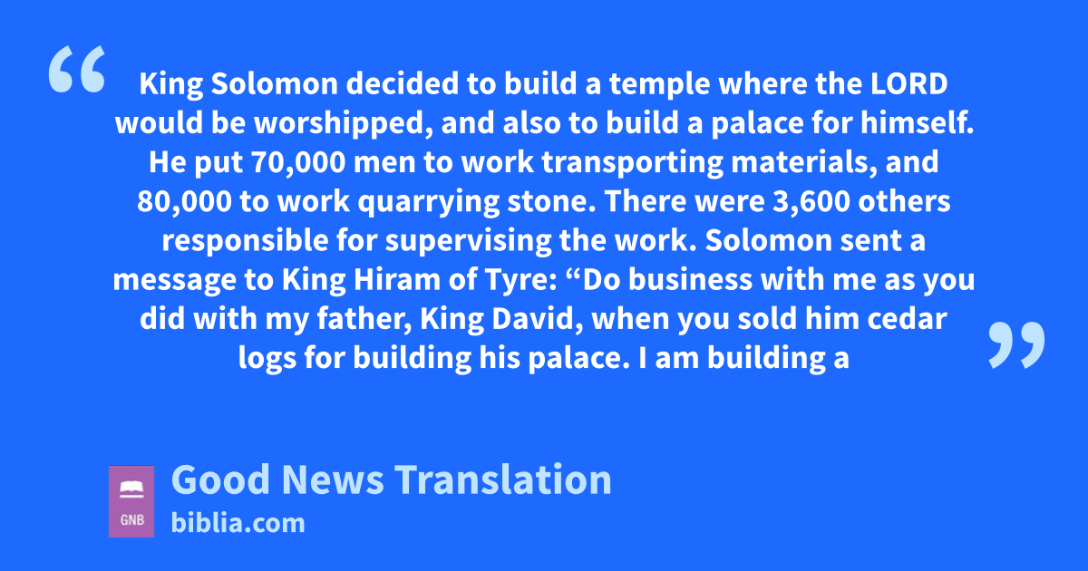 2 King Solomon decided to build a temple where the Lord would be worshipped, and also to build a palace for himself. 2He put 70,000 men to work transporting materials, and 80,000 to work quarrying stone. There were 3,600 others responsible for supervising the work.