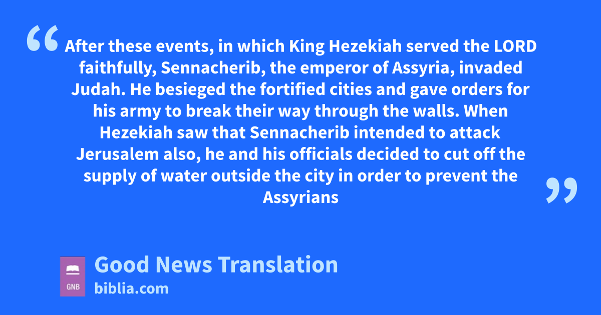32 After these events, in which King Hezekiah served the Lord faithfully, Sennacherib, the emperor of Assyria, invaded Judah. He besieged the fortified cities and gave orders for his army to break their way through the walls. 2When Hezekiah saw that Sennacherib intended to attack Jerusalem also, 3–4he and his officials decided to cut off the supply of water outside the city in order to prevent the Assyrians from having any water when they got near Jerusalem. The officials led a large number of people out and stopped up all the springs, so that no more water flowed out of them. 5The king strengthened the city’s defences by repairing the wall, building towers on it,u and building an outer wall. In addition, he repaired the defences built on the land that was filled in on the east side of the old part of Jerusalem. He also had a large number of spears and shields made. 6He placed all the men in the city under the command of army officers and ordered them to assemble in the open square at the city gate. He said to them, 7“Be determined and confident, and don’t be afraid of the Assyrian emperor or of the army he is leading. We have more power on our side than he has on his. 8He has human power, but we have the Lord our God to help us and to fight our battles.” The people were encouraged by these words of their king.