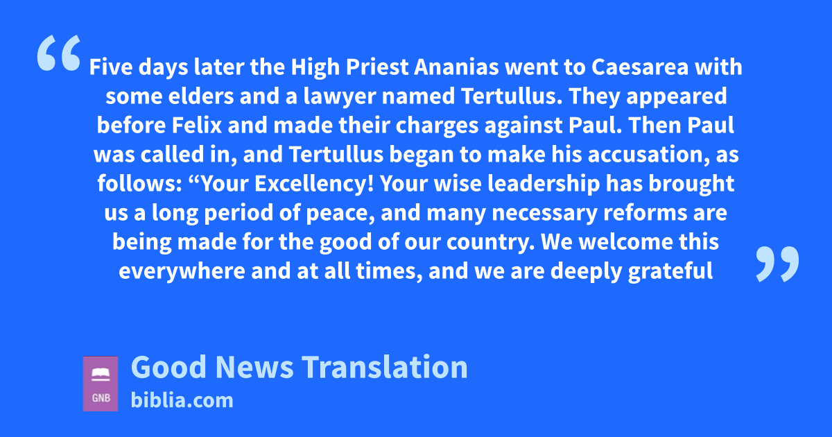 24 Five days later the High Priest Ananias went to Caesarea with some elders and a lawyer named Tertullus. They appeared before Felix and made their charges against Paul. 2Then Paul was called in, and Tertullus began to make his accusation, as follows: