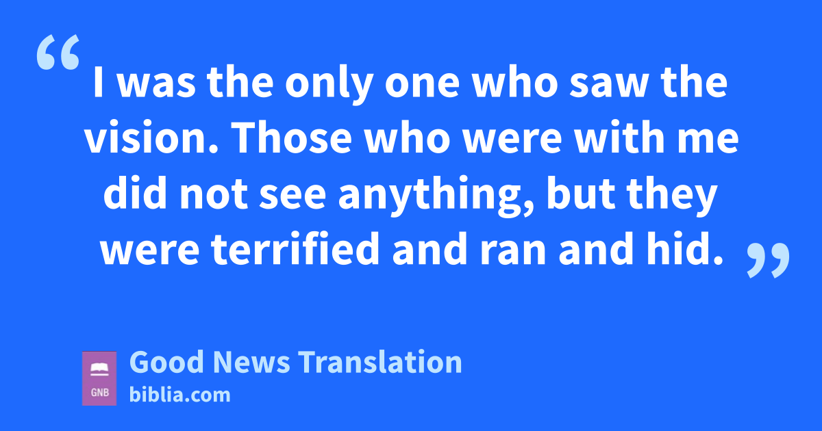 7 I was the only one who saw the vision. Those who were with me did not see anything, but they were terrified and ran and hid. 8I was left there alone, watching this amazing vision. I had no strength left, and my face was so changed that no one could have recognized me. 9When I heard his voice, I fell to the ground unconscious and lay there face downwards. 10Then a hand took hold of me and raised me to my hands and knees; I was still trembling.
