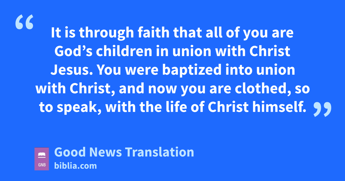 26 It is through faith that all of you are God’s children in union with Christ Jesus. 27You were baptized into union with Christ, and now you are clothed, so to speak, with the life of Christ himself. 28So there is no difference between Jews and Gentiles, between slaves and free people, between men and women; you are all one in union with Christ Jesus. 29*If you belong to Christ, then you are the descendants of Abraham and will receive what God has promised.