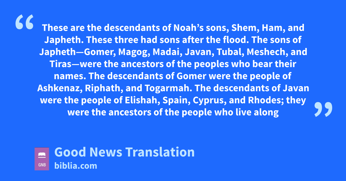2 The sons of Japheth—Gomer, Magog, Madai, Javan, Tubal, Meshech, and Tiras—were the ancestors of the peoples who bear their names. 3The descendants of Gomer were the people of Ashkenaz, Riphath, and Togarmah. 4The descendants of Javan were the people of Elishah, Spain, Cyprus, and Rhodes; 5they were the ancestors of the people who live along the coast and on the islands. These are the descendants of Japheth, living in their different tribes and countries, each group speaking its own language.