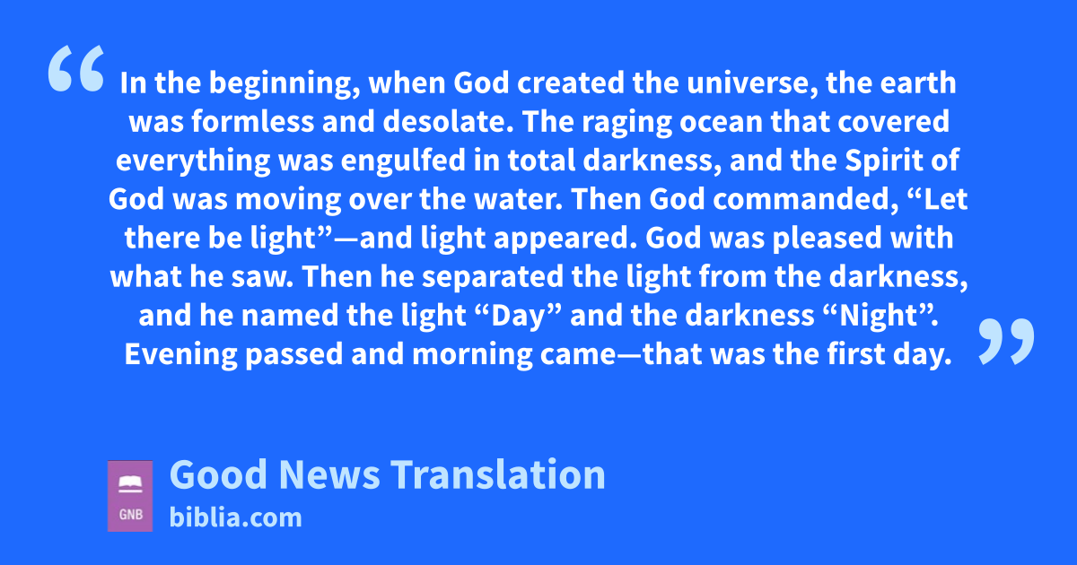 1 In the beginning, when God created the universe,a 2the earth was formless and desolate. The raging ocean that covered everything was engulfed in total darkness, and the Spirit of Godb was moving over the water. 3*Then God commanded, “Let there be light”—and light appeared. 4God was pleased with what he saw. Then he separated the light from the darkness, 5and he named the light “Day” and the darkness “Night”. Evening passed and morning came—that was the first day.