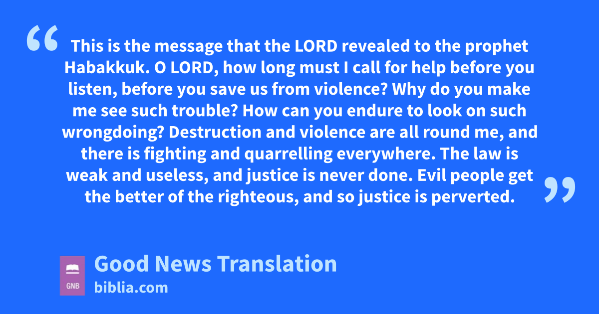 2 O Lord, how long must I call for help before you listen, before you save us from violence? 3Why do you make me see such trouble? How can you endure to look on such wrongdoing? Destruction and violence are all round me, and there is fighting and quarrelling everywhere. 4The law is weak and useless, and justice is never done. Evil people get the better of the righteous, and so justice is perverted.