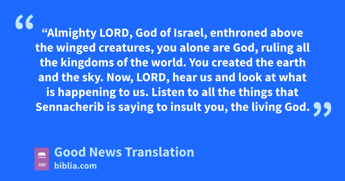 14 King Hezekiah took the letter from the messengers and read it. Then he went to the Temple, placed the letter there in the presence of the Lord, 15and prayed, 16*“Almighty Lord, God of Israel, enthroned above the winged creatures, you alone are God, ruling all the kingdoms of the world. You created the earth and the sky. 17Now, Lord, hear us and look at what is happening to us. Listen to all the things that Sennacherib is saying to insult you, the living God. 18We all know, Lord, that the emperors of Assyria have destroyed many nations, made their lands desolate, 19and burnt up their gods—which were no gods at all, only images of wood and stone made by human hands. 20Now, Lord our God, rescue us from the Assyrians, so that all the nations of the world will know that you alone are God.”