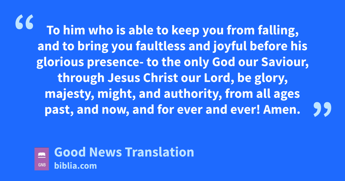 24 To him who is able to keep you from falling, and to bring you faultless and joyful before his glorious presence- 25to the only God our Saviour, through Jesus Christ our Lord, be glory, majesty, might, and authority, from all ages past, and now, and for ever and ever! Amen.
