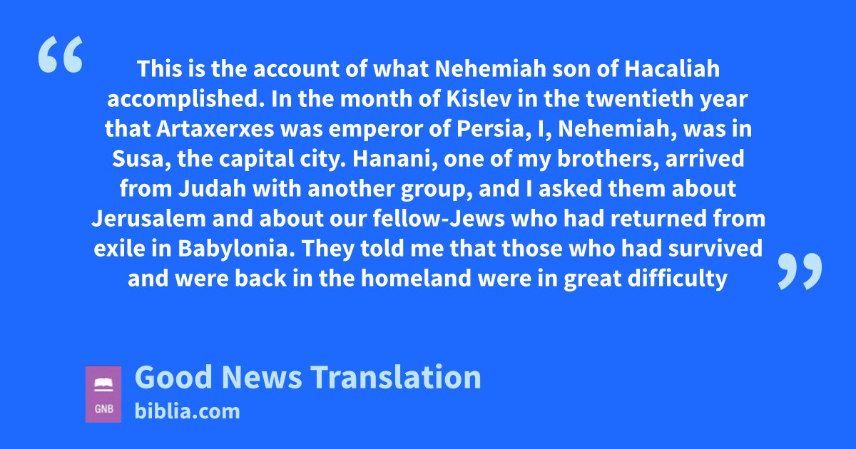 In the month of Kislev in the twentieth year that Artaxerxes was emperor of Persia, I, Nehemiah, was in Susa, the capital city. 2Hanani, one of my brothers, arrived from Judah with another group, and I asked them about Jerusalem and about our fellow-Jews who had returned from exile ina Babylonia. 3They told me that those who had survived and were back in the homelandb were in great difficulty and that the foreigners who lived near by looked down on them. They also told me that the walls of Jerusalem were still broken down and that the gates had not been restored since the time they were burnt. 4When I heard all this, I sat down and wept.