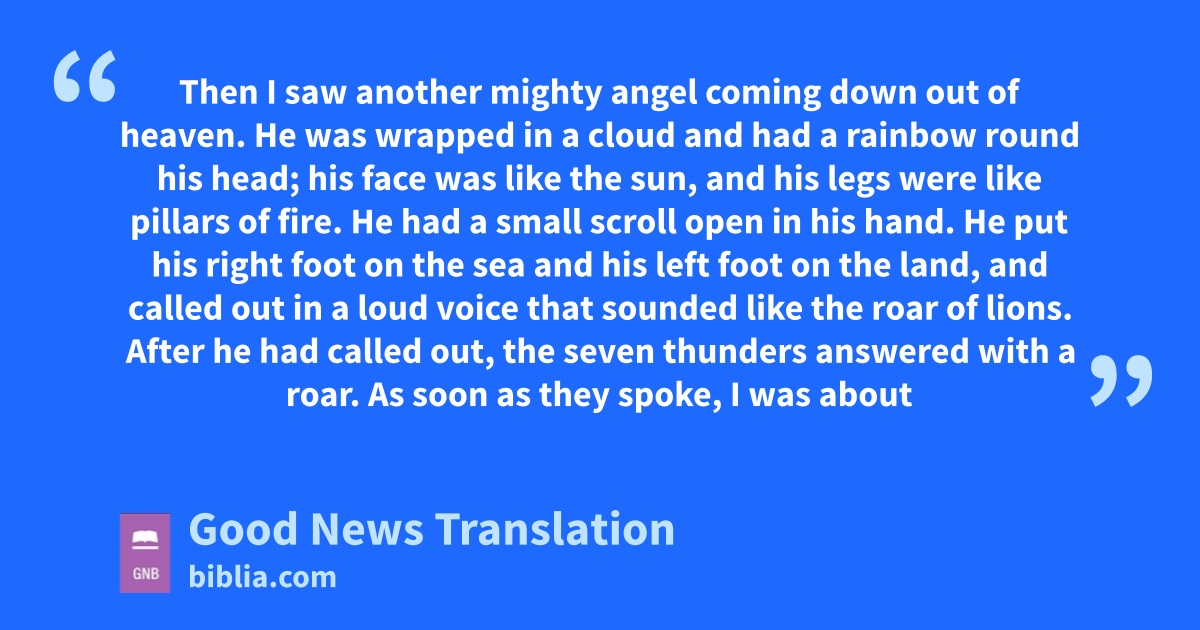 10 Then I saw another mighty angel coming down out of heaven. He was wrapped in a cloud and had a rainbow round his head; his face was like the sun, and his legs were like pillars of fire. 2He had a small scroll open in his hand. He put his right foot on the sea and his left foot on the land, 3and called out in a loud voice that sounded like the roar of lions. After he had called out, the seven thunders answered with a roar. 4As soon as they spoke, I was about to write. But I heard a voice speak from heaven, “Keep secret what the seven thunders have said; do not write it down!”
