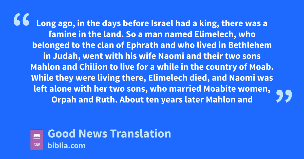 1 1–2 Long ago, in the days before Israel had a king, there was a famine in the land. So a man named Elimelech, who belonged to the clan of Ephrath and who lived in Bethlehem in Judah, went with his wife Naomi and their two sons Mahlon and Chilion to live for a while in the country of Moab. While they were living there, 3Elimelech died, and Naomi was left alone with her two sons, 4who married Moabite women, Orpah and Ruth. About ten years later 5Mahlon and Chilion also died, and Naomi was left all alone, without husband or sons.