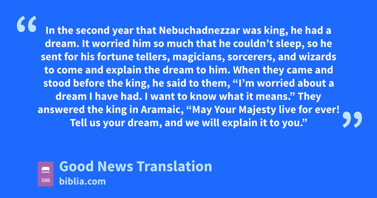 2 In the second year that Nebuchadnezzar was king, he had a dream. It worried him so much that he couldn’t sleep, 2so he sent for his fortune tellers, magicians, sorcerers, and wizards to come and explain the dream to him. When they came and stood before the king, 3he said to them, “I’m worried about a dream I have had. I want to know what it means.”