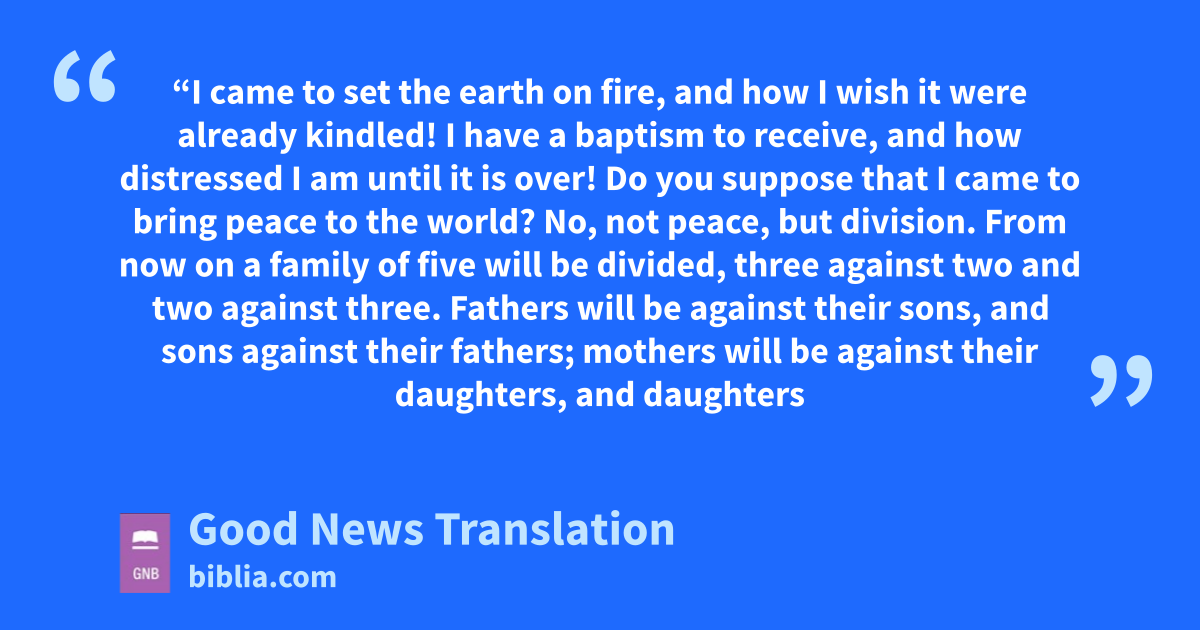 49 “I came to set the earth on fire, and how I wish it were already kindled! 50*I have a baptism to receive, and how distressed I am until it is over! 51Do you suppose that I came to bring peace to the world? No, not peace, but division. 52From now on a family of five will be divided, three against two and two against three. 53*Fathers will be against their sons, and sons against their fathers; mothers will be against their daughters, and daughters against their mothers; mothers-in-law will be against their daughters-in-law, and daughters-in-law against their mothers-in-law.”