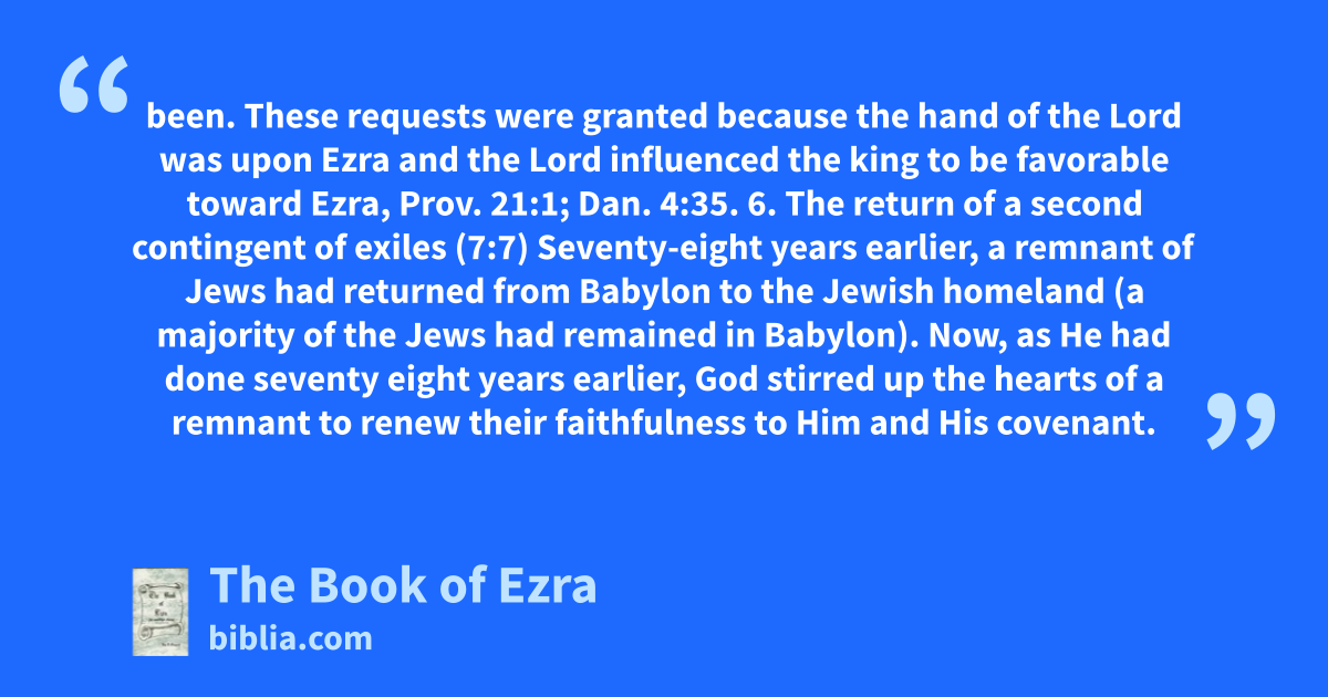been. These requests were granted because the hand of the Lord was upon Ezra and the Lord influenced the king to be favorable toward Ezra, Prov. 21:1; Dan. 4:35. 6. The return of a second contingent of exiles (7:7) Seventy-eight years earlier, a remnant of Jews had returned from Babylon to the Jewish homeland (a majority of the Jews had remained in Babylon). Now, as He had done seventy eight years earlier, God stirred up the hearts of a remnant to renew their faithfulness to Him and His covenant.