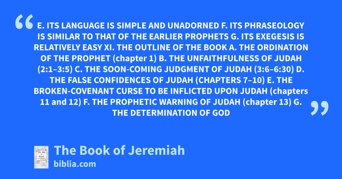 E. ITS LANGUAGE IS SIMPLE AND UNADORNED F. ITS PHRASEOLOGY IS SIMILAR TO THAT OF THE EARLIER PROPHETS G. ITS EXEGESIS IS RELATIVELY EASY XI. THE OUTLINE OF THE BOOK A. THE ORDINATION OF THE PROPHET (chapter 1) B. THE UNFAITHFULNESS OF JUDAH (2:1–3:5) C. THE SOON-COMING JUDGMENT OF JUDAH (3:6–6:30) D. THE FALSE CONFIDENCES OF JUDAH (CHAPTERS 7–10) E. THE BROKEN-COVENANT CURSE TO BE INFLICTED UPON JUDAH (chapters 11 and 12) F. THE PROPHETIC WARNING OF JUDAH (chapter 13) G. THE DETERMINATION OF GOD