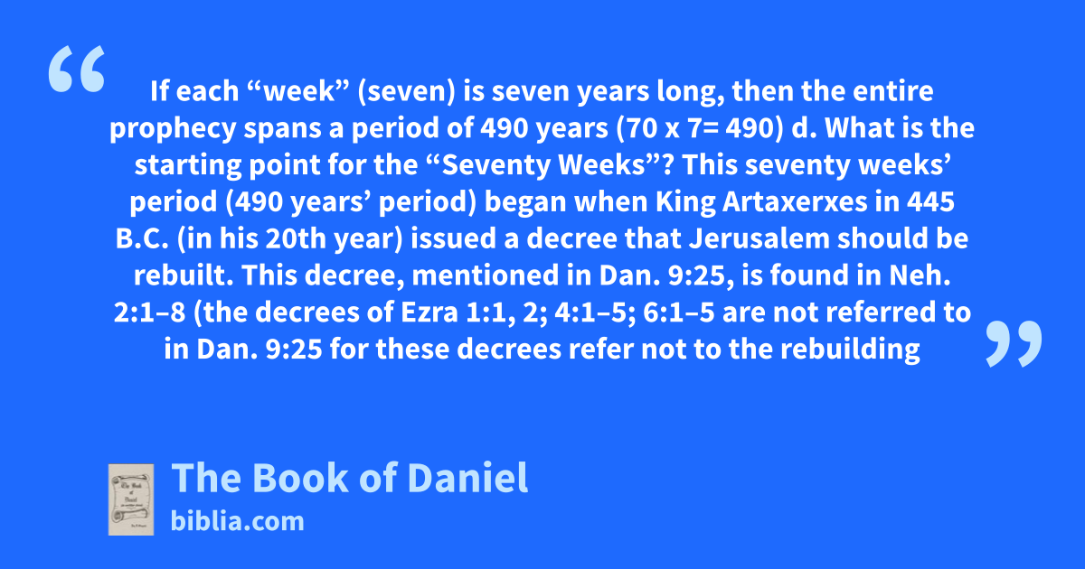 If each “week” (seven) is seven years long, then the entire prophecy spans a period of 490 years (70 x 7= 490) d. What is the starting point for the “Seventy Weeks”? This seventy weeks’ period (490 years’ period) began when King Artaxerxes in 445 B.C. (in his 20th year) issued a decree that Jerusalem should be rebuilt. This decree, mentioned in Dan. 9:25, is found in Neh. 2:1–8 (the decrees of Ezra 1:1, 2; 4:1–5; 6:1–5 are not referred to in Dan. 9:25 for these decrees refer not to the rebuilding