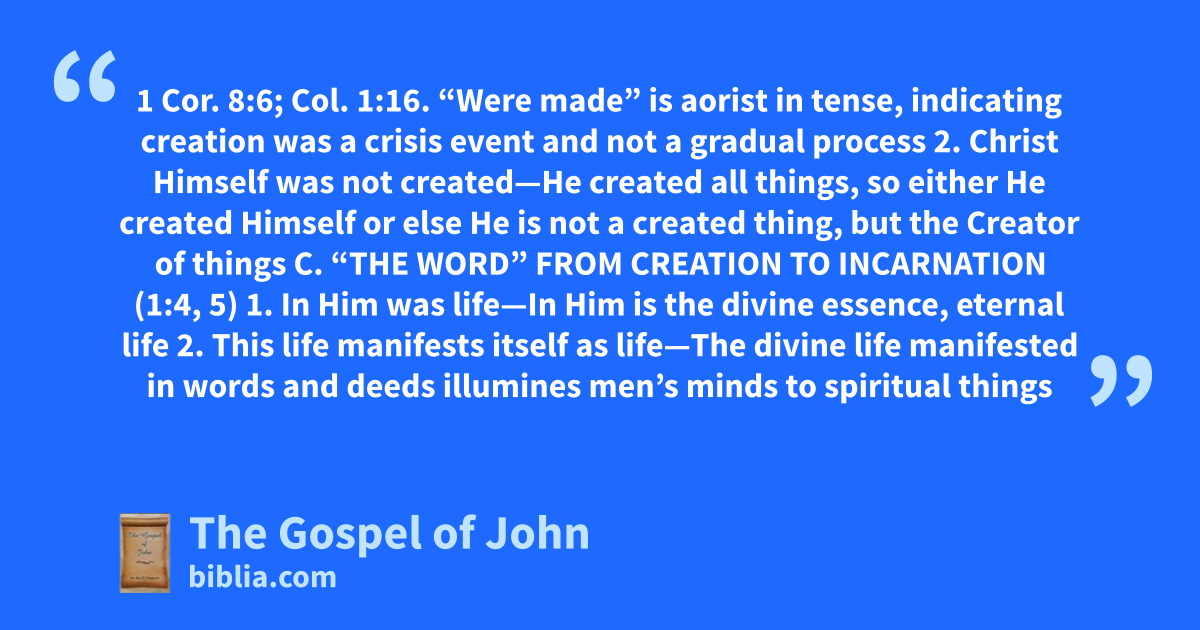 1 Cor. 8:6; Col. 1:16. “Were made” is aorist in tense, indicating creation was a crisis event and not a gradual process 2. Christ Himself was not created—He created all things, so either He created Himself or else He is not a created thing, but the Creator of things C. “THE WORD” FROM CREATION TO INCARNATION (1:4, 5) 1. In Him was life—In Him is the divine essence, eternal life 2. This life manifests itself as life—The divine life manifested in words and deeds illumines men’s minds to spiritual things