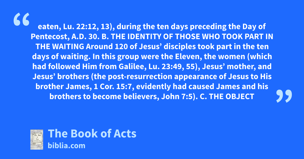 eaten, Lu. 22:12, 13), during the ten days preceding the Day of Pentecost, A.D. 30. B. THE IDENTITY OF THOSE WHO TOOK PART IN THE WAITING Around 120 of Jesus’ disciples took part in the ten days of waiting. In this group were the Eleven, the women (which had followed Him from Galilee, Lu. 23:49, 55), Jesus’ mother, and Jesus’ brothers (the post-resurrection appearance of Jesus to His brother James, 1 Cor. 15:7, evidently had caused James and his brothers to become believers, John 7:5). C. THE OBJECT