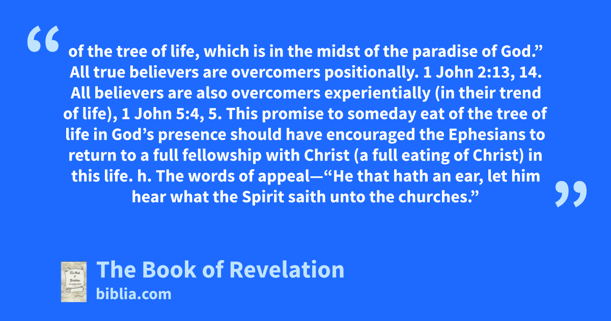 of the tree of life, which is in the midst of the paradise of God.” All true believers are overcomers positionally. 1 John 2:13, 14. All believers are also overcomers experientially (in their trend of life), 1 John 5:4, 5. This promise to someday eat of the tree of life in God’s presence should have encouraged the Ephesians to return to a full fellowship with Christ (a full eating of Christ) in this life. h. The words of appeal—“He that hath an ear, let him hear what the Spirit saith unto the churches.”