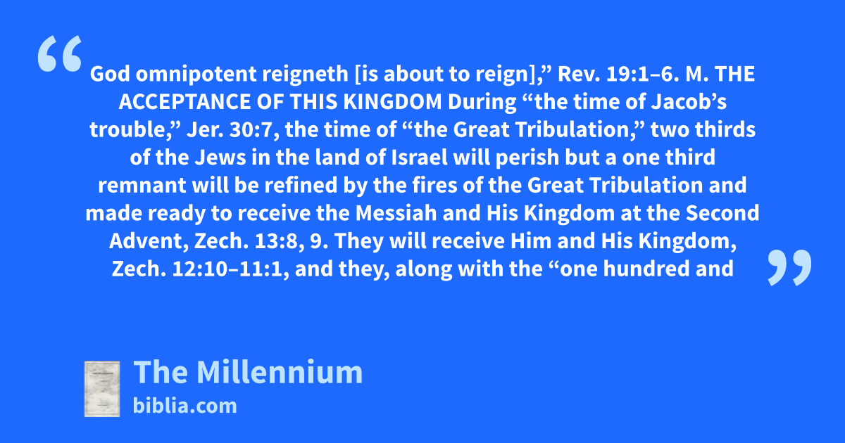 God omnipotent reigneth [is about to reign],” Rev. 19:1–6. M. THE ACCEPTANCE OF THIS KINGDOM During “the time of Jacob’s trouble,” Jer. 30:7, the time of “the Great Tribulation,” two thirds of the Jews in the land of Israel will perish but a one third remnant will be refined by the fires of the Great Tribulation and made ready to receive the Messiah and His Kingdom at the Second Advent, Zech. 13:8, 9. They will receive Him and His Kingdom, Zech. 12:10–11:1, and they, along with the “one hundred and