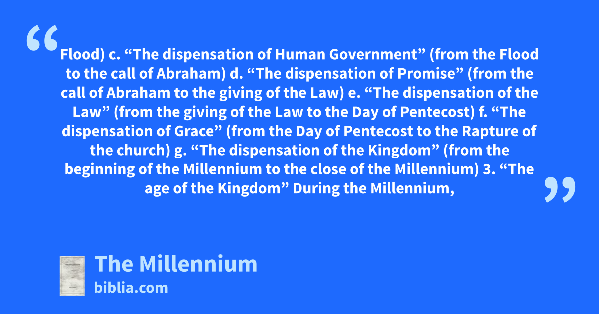 Flood) c. “The dispensation of Human Government” (from the Flood to the call of Abraham) d. “The dispensation of Promise” (from the call of Abraham to the giving of the Law) e. “The dispensation of the Law” (from the giving of the Law to the Day of Pentecost) f. “The dispensation of Grace” (from the Day of Pentecost to the Rapture of the church) g. “The dispensation of the Kingdom” (from the beginning of the Millennium to the close of the Millennium) 3. “The age of the Kingdom” During the Millennium,