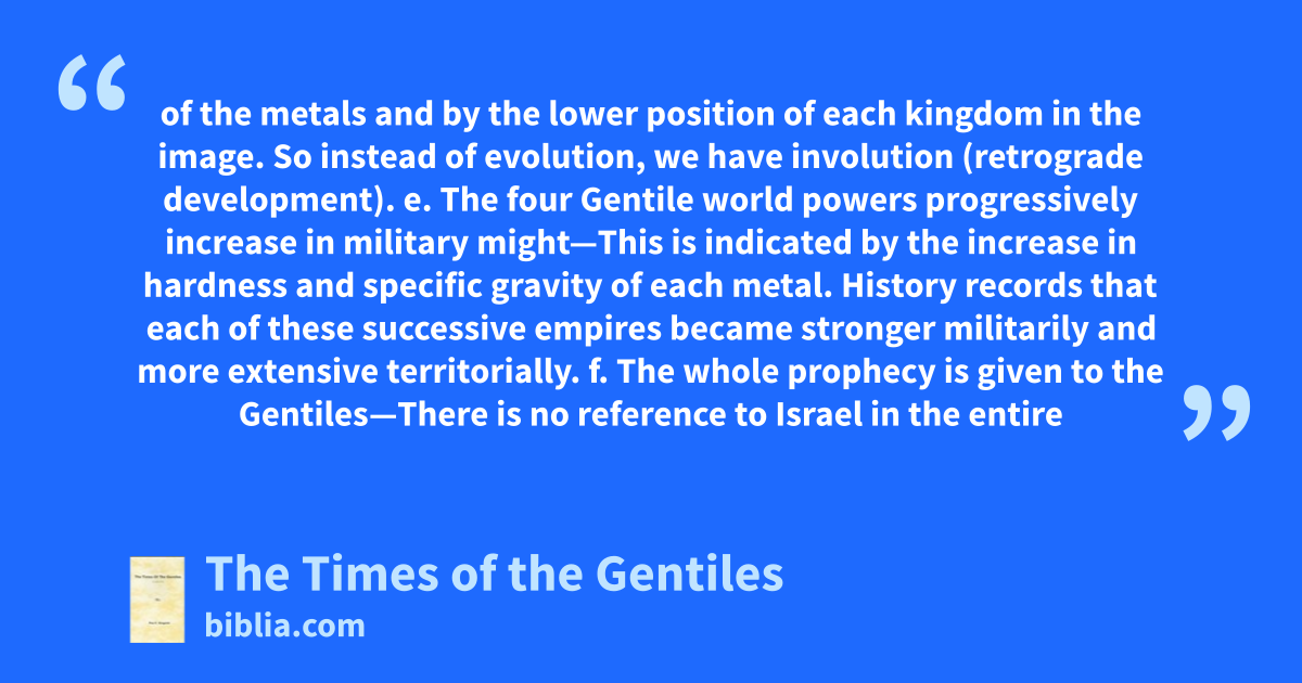 of the metals and by the lower position of each kingdom in the image. So instead of evolution, we have involution (retrograde development). e. The four Gentile world powers progressively increase in military might—This is indicated by the increase in hardness and specific gravity of each metal. History records that each of these successive empires became stronger militarily and more extensive territorially. f. The whole prophecy is given to the Gentiles—There is no reference to Israel in the entire