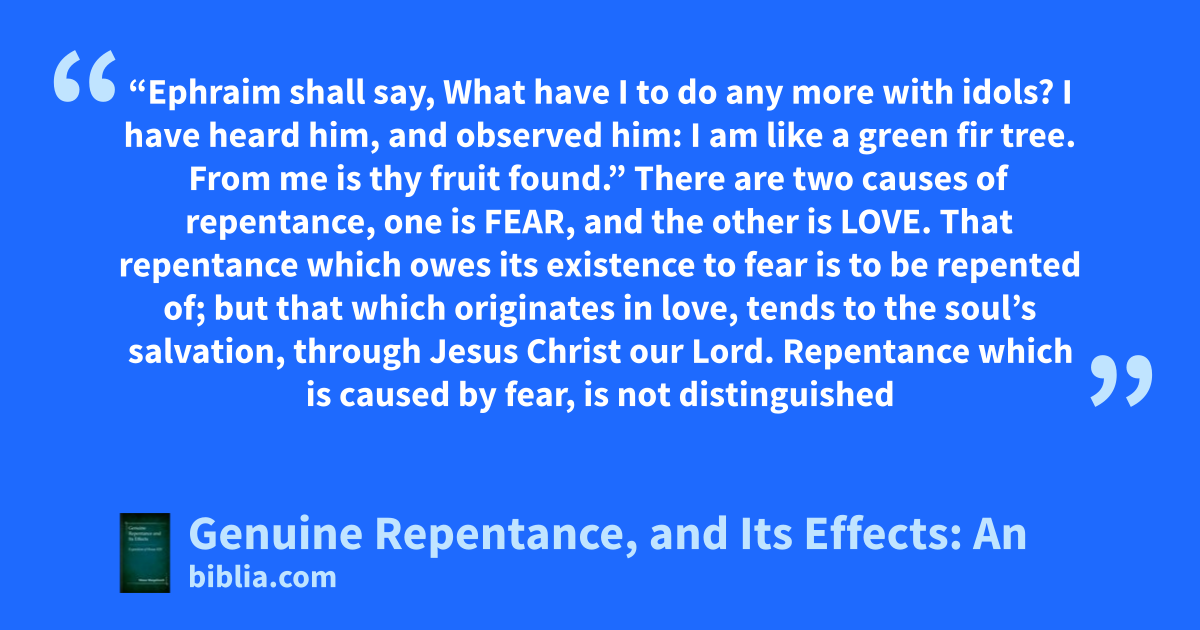 “Ephraim shall say, What have I to do any more with idols? I have heard him, and observed him: I am like a green fir tree. From me is thy fruit found.” There are two causes of repentance, one is FEAR, and the other is LOVE. That repentance which owes its existence to fear is to be repented of; but that which originates in love, tends to the soul’s salvation, through Jesus Christ our Lord. Repentance which is caused by fear, is not distinguished