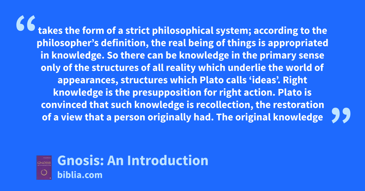 takes the form of a strict philosophical system; according to the philosopher’s definition, the real being of things is appropriated in knowledge. So there can be knowledge in the primary sense only of the structures of all reality which underlie the world of appearances, structures which Plato calls ‘ideas’. Right knowledge is the presupposition for right action. Plato is convinced that such knowledge is recollection, the restoration of a view that a person originally had. The original knowledge
