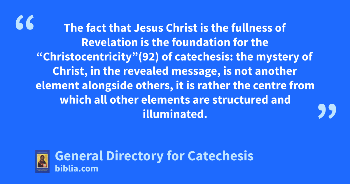 The fact that Jesus Christ is the fullness of Revelation is the foundation for the “Christocentricity”(92) of catechesis: the mystery of Christ, in the revealed message, is not another element alongside others, it is rather the centre from which all other elements are structured and illuminated.