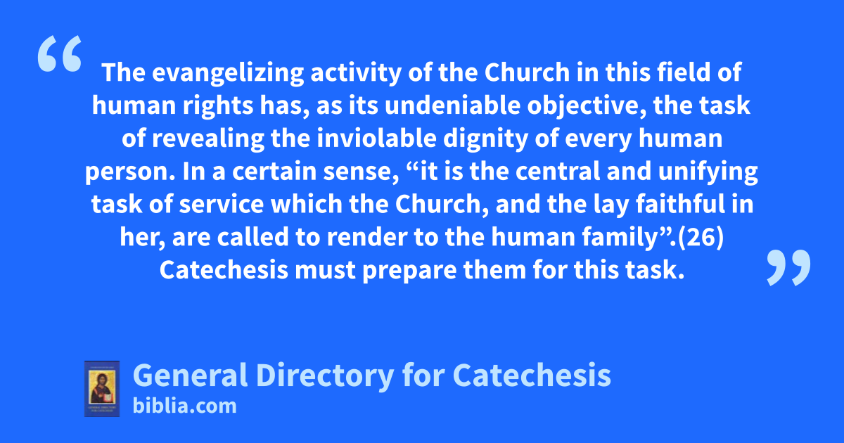 The evangelizing activity of the Church in this field of human rights has, as its undeniable objective, the task of revealing the inviolable dignity of every human person. In a certain sense, “it is the central and unifying task of service which the Church, and the lay faithful in her, are called to render to the human family”.(26) Catechesis must prepare them for this task.