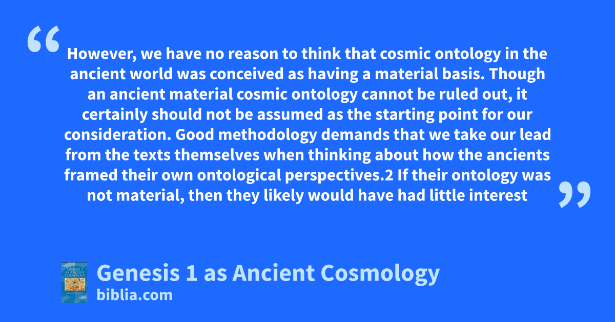 However, we have no reason to think that cosmic ontology in the ancient world was conceived as having a material basis. Though an ancient material cosmic ontology cannot be ruled out, it certainly should not be assumed as the starting point for our consideration. Good methodology demands that we take our lead from the texts themselves when thinking about how the ancients framed their own ontological perspectives.2 If their ontology was not material, then they likely would have had little interest