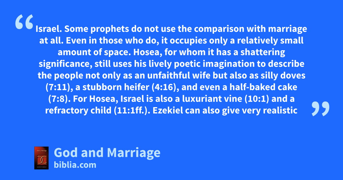 Israel. Some prophets do not use the comparison with marriage at all. Even in those who do, it occupies only a relatively small amount of space. Hosea, for whom it has a shattering significance, still uses his lively poetic imagination to describe the people not only as an unfaithful wife but also as silly doves (7:11), a stubborn heifer (4:16), and even a half-baked cake (7:8). For Hosea, Israel is also a luxuriant vine (10:1) and a refractory child (11:1ff.). Ezekiel can also give very realistic