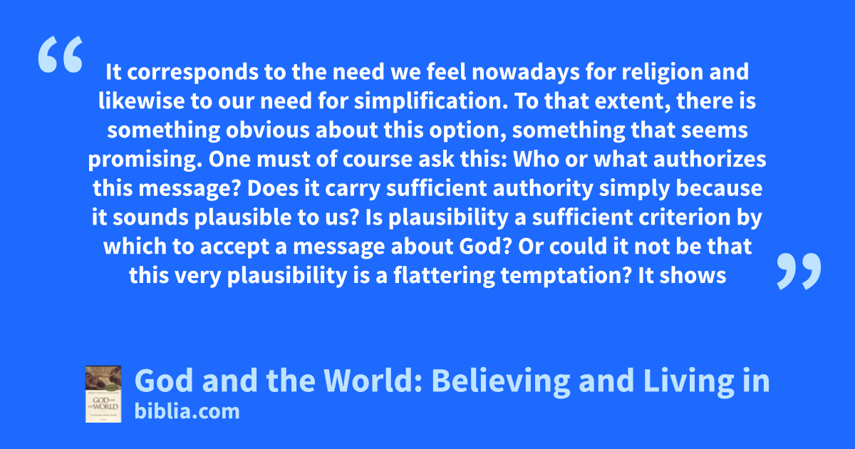 It corresponds to the need we feel nowadays for religion and likewise to our need for simplification. To that extent, there is something obvious about this option, something that seems promising. One must of course ask this: Who or what authorizes this message? Does it carry sufficient authority simply because it sounds plausible to us? Is plausibility a sufficient criterion by which to accept a message about God? Or could it not be that this very plausibility is a flattering temptation? It shows