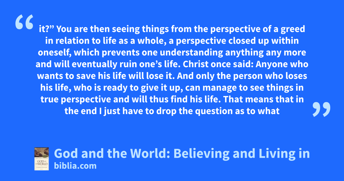 it?” You are then seeing things from the perspective of a greed in relation to life as a whole, a perspective closed up within oneself, which prevents one understanding anything any more and will eventually ruin one’s life. Christ once said: Anyone who wants to save his life will lose it. And only the person who loses his life, who is ready to give it up, can manage to see things in true perspective and will thus find his life. That means that in the end I just have to drop the question as to what