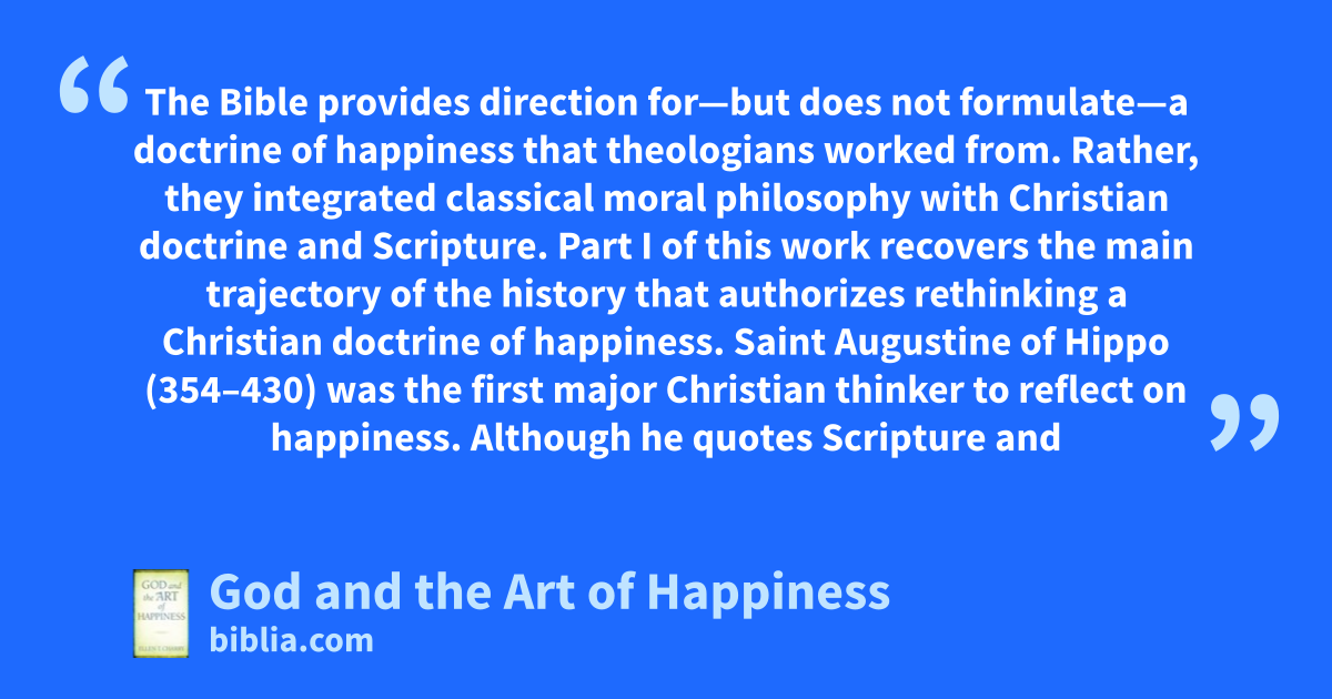 The Bible provides direction for—but does not formulate—a doctrine of happiness that theologians worked from. Rather, they integrated classical moral philosophy with Christian doctrine and Scripture. Part I of this work recovers the main trajectory of the history that authorizes rethinking a Christian doctrine of happiness. Saint Augustine of Hippo (354–430) was the first major Christian thinker to reflect on happiness. Although he quotes Scripture and