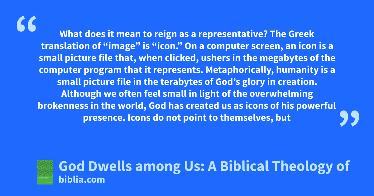 What does it mean to reign as a representative? The Greek translation of “image” is “icon.” On a computer screen, an icon is a small picture file that, when clicked, ushers in the megabytes of the computer program that it represents. Metaphorically, humanity is a small picture file in the terabytes of God’s glory in creation. Although we often feel small in light of the overwhelming brokenness in the world, God has created us as icons of his powerful presence. Icons do not point to themselves, but
