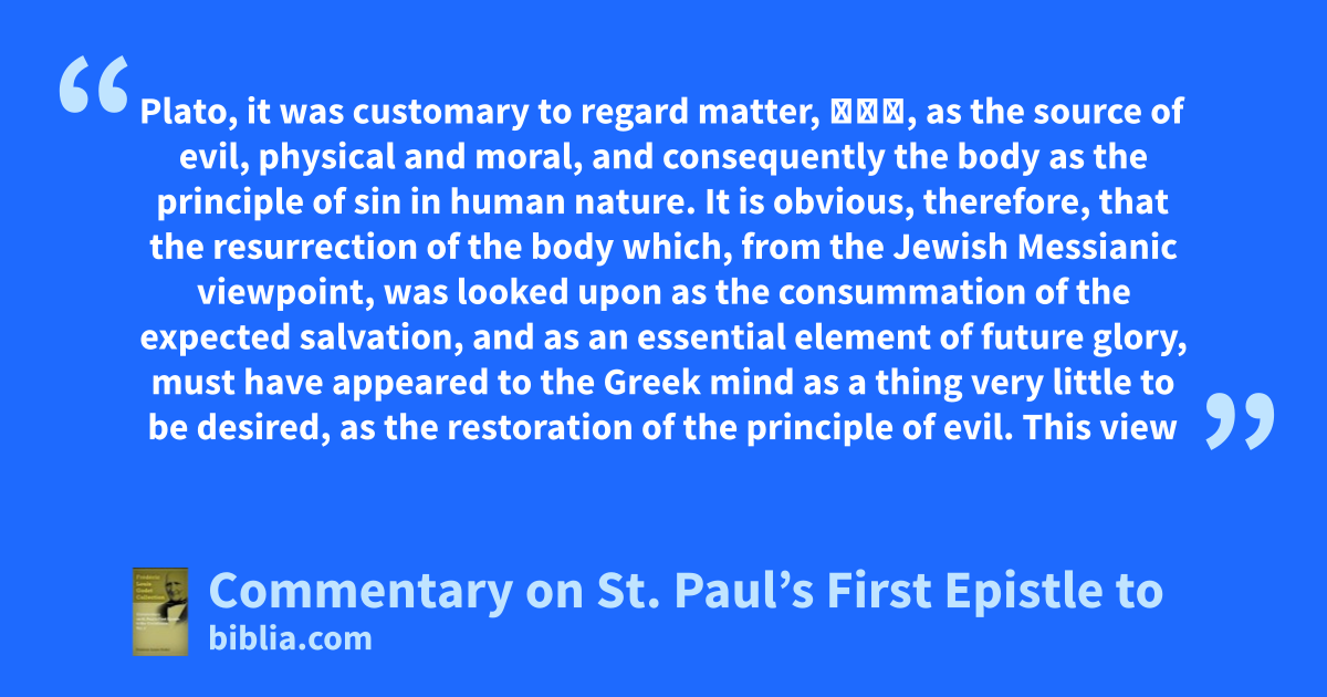 Plato, it was customary to regard matter, ὕλη, as the source of evil, physical and moral, and consequently the body as the principle of sin in human nature. It is obvious, therefore, that the resurrection of the body which, from the Jewish Messianic viewpoint, was looked upon as the consummation of the expected salvation, and as an essential element of future glory, must have appeared to the Greek mind as a thing very little to be desired, as the restoration of the principle of evil. This view
