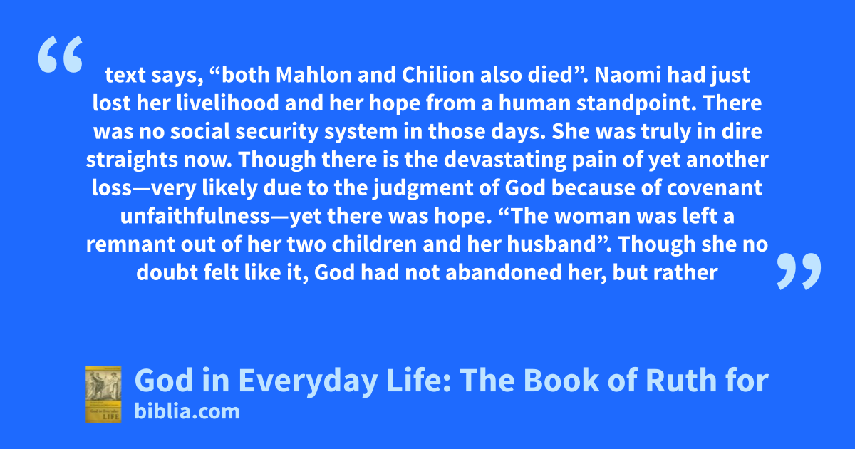 text says, “both Mahlon and Chilion also died”. Naomi had just lost her livelihood and her hope from a human standpoint. There was no social security system in those days. She was truly in dire straights now. Though there is the devastating pain of yet another loss—very likely due to the judgment of God because of covenant unfaithfulness—yet there was hope. “The woman was left a remnant out of her two children and her husband”. Though she no doubt felt like it, God had not abandoned her, but rather