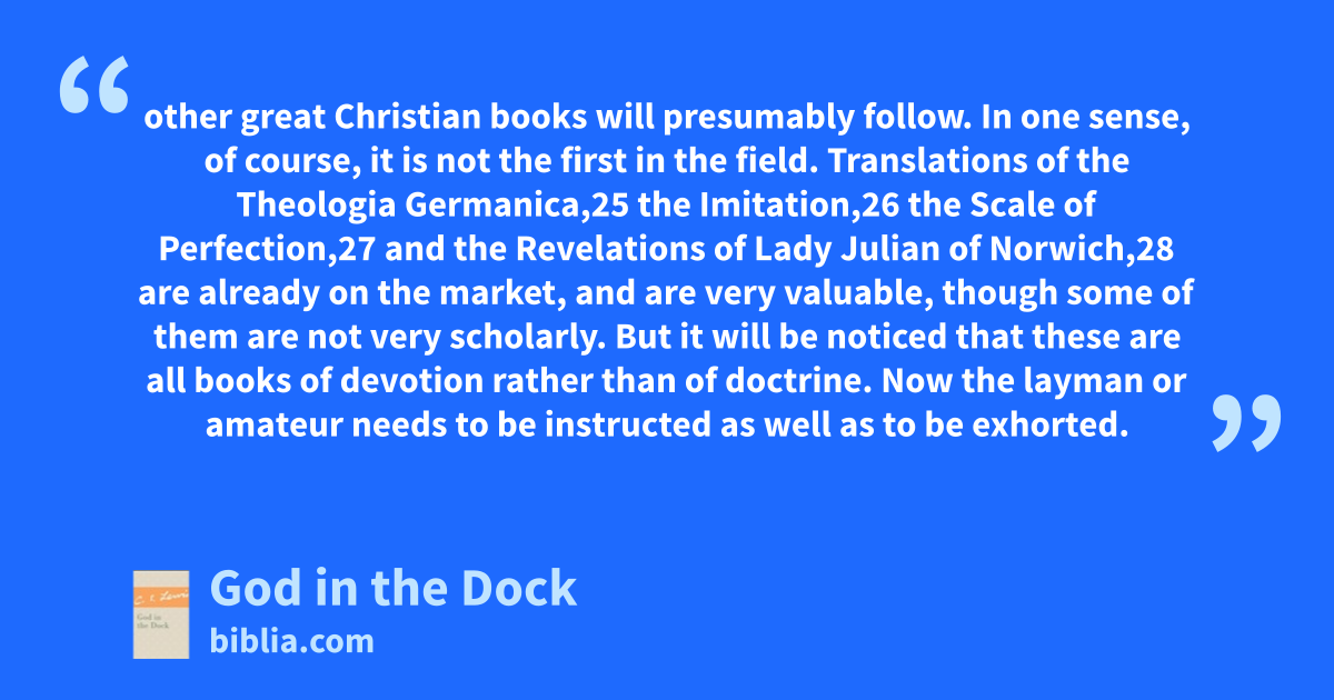 God in the Dock is one of the best known of C. S. Lewis’ essay collections and includes “Myth Become Fact,” “The Grand Miracle,” “Priestesses in the Church,” and “God in the Dock”.