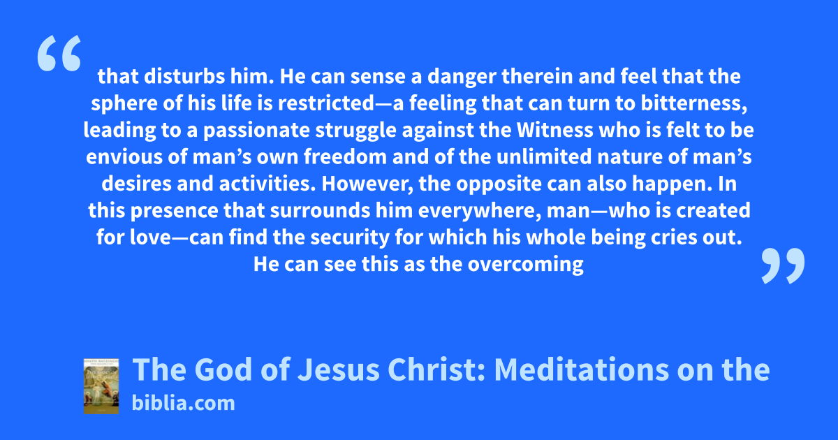 that disturbs him. He can sense a danger therein and feel that the sphere of his life is restricted—a feeling that can turn to bitterness, leading to a passionate struggle against the Witness who is felt to be envious of man’s own freedom and of the unlimited nature of man’s desires and activities. However, the opposite can also happen. In this presence that surrounds him everywhere, man—who is created for love—can find the security for which his whole being cries out. He can see this as the overcoming