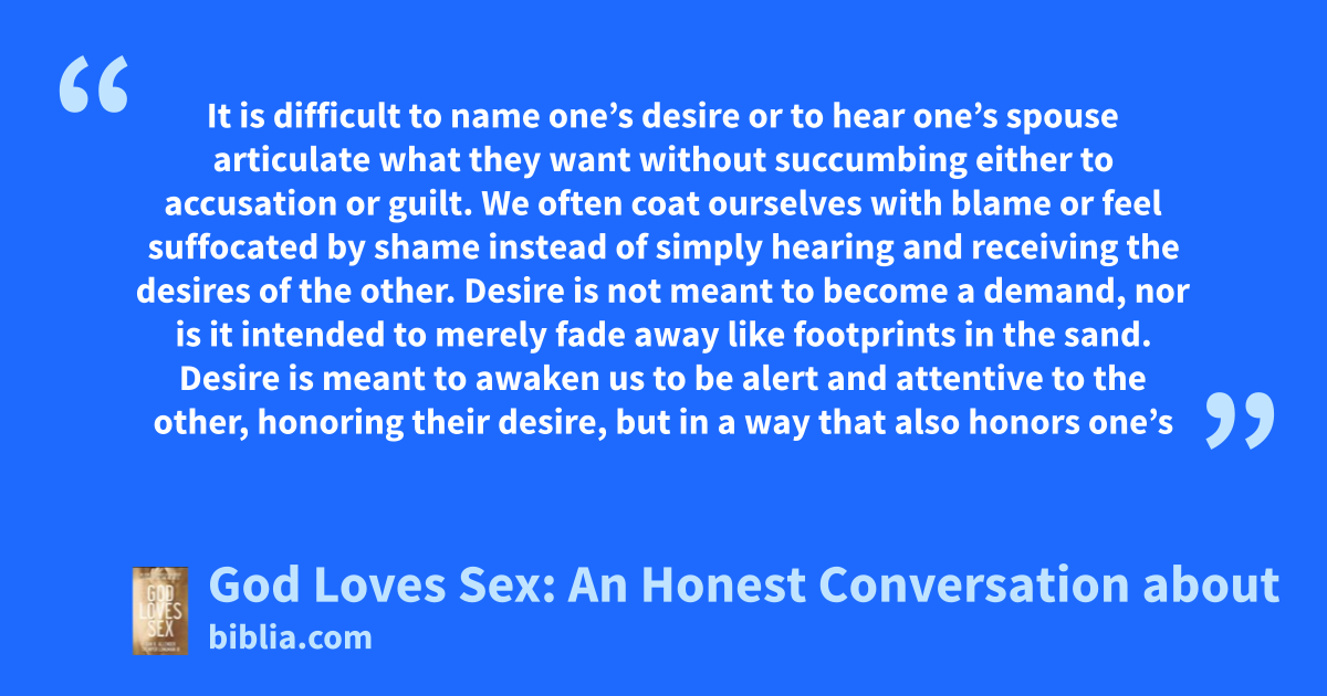 It is difficult to name one’s desire or to hear one’s spouse articulate what they want without succumbing either to accusation or guilt. We often coat ourselves with blame or feel suffocated by shame instead of simply hearing and receiving the desires of the other. Desire is not meant to become a demand, nor is it intended to merely fade away like footprints in the sand. Desire is meant to awaken us to be alert and attentive to the other, honoring their desire, but in a way that also honors one’s