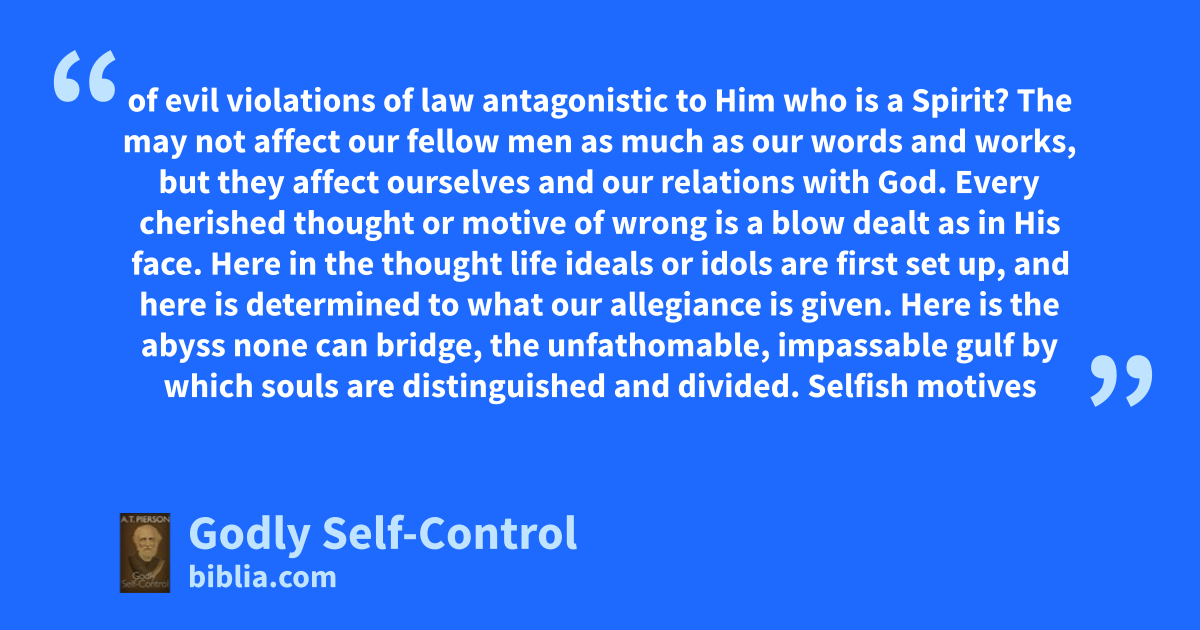 of evil violations of law antagonistic to Him who is a Spirit? The may not affect our fellow men as much as our words and works, but they affect ourselves and our relations with God. Every cherished thought or motive of wrong is a blow dealt as in His face. Here in the thought life ideals or idols are first set up, and here is determined to what our allegiance is given. Here is the abyss none can bridge, the unfathomable, impassable gulf by which souls are distinguished and divided. Selfish motives